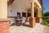 Über eine überdachte und mit Gartenmöbeln ausgestattete Terrasse, gelangt man in die Erdgeschosswohnung. Diese verfügt über einen Essbereich mit moderner Küche, drei separaten Schlafzimmern mit jeweils einem Doppelbett, sowie ein Badezimmer mit Dusche und einer Waschmaschine. Die Toilette befindet sich in einem separaten Raum.