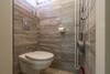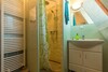Die Wohnung verfügt über zwei Schlafzimmer, eines mit einem Doppelbett und einem kleinen, dekorativen Babybett, sowie eines mit einem Einzel und einem Doppelbett. Das Badezimmer hat eine Dusche, das WC befindet sich in einem separaten Raum.